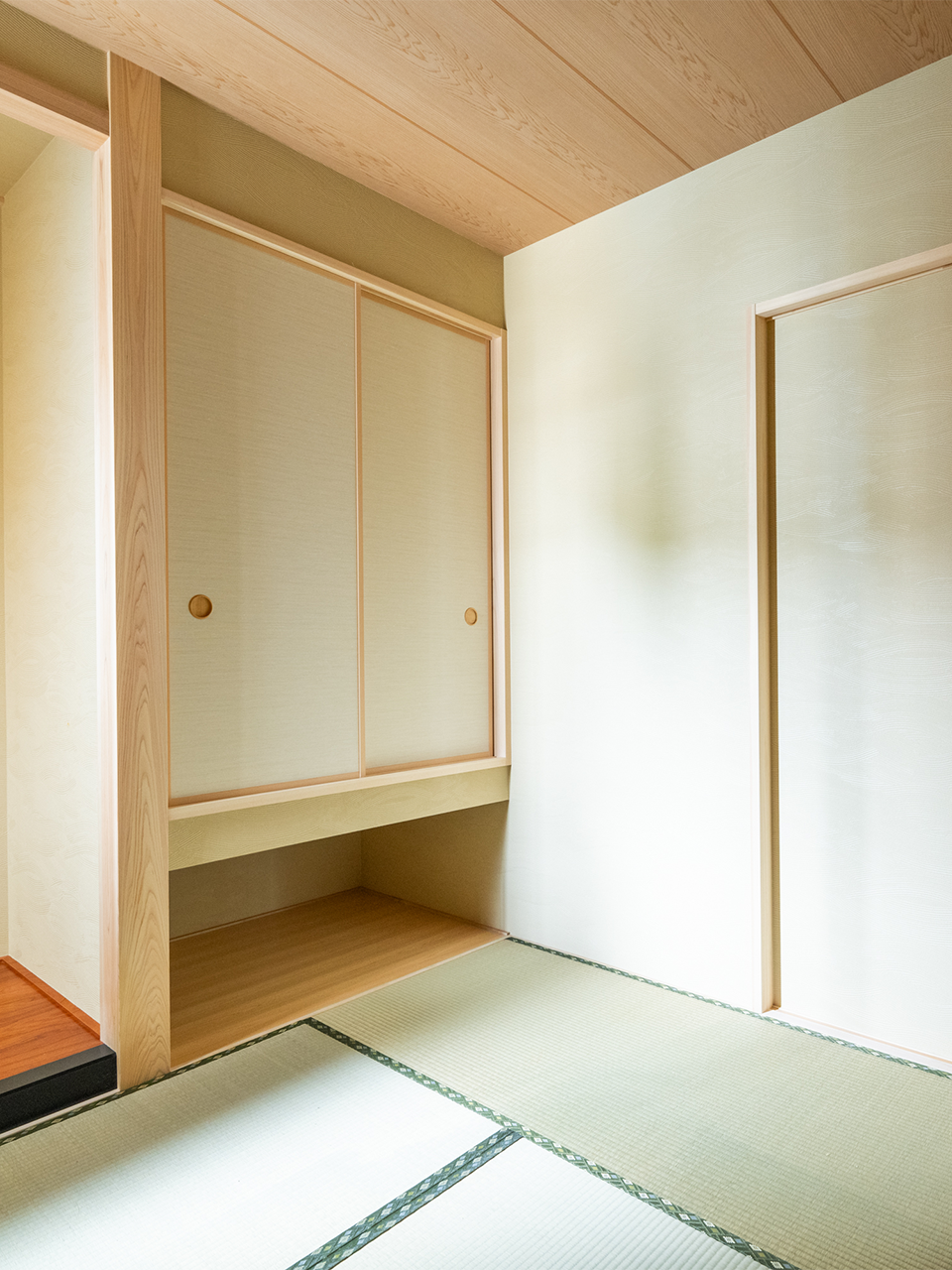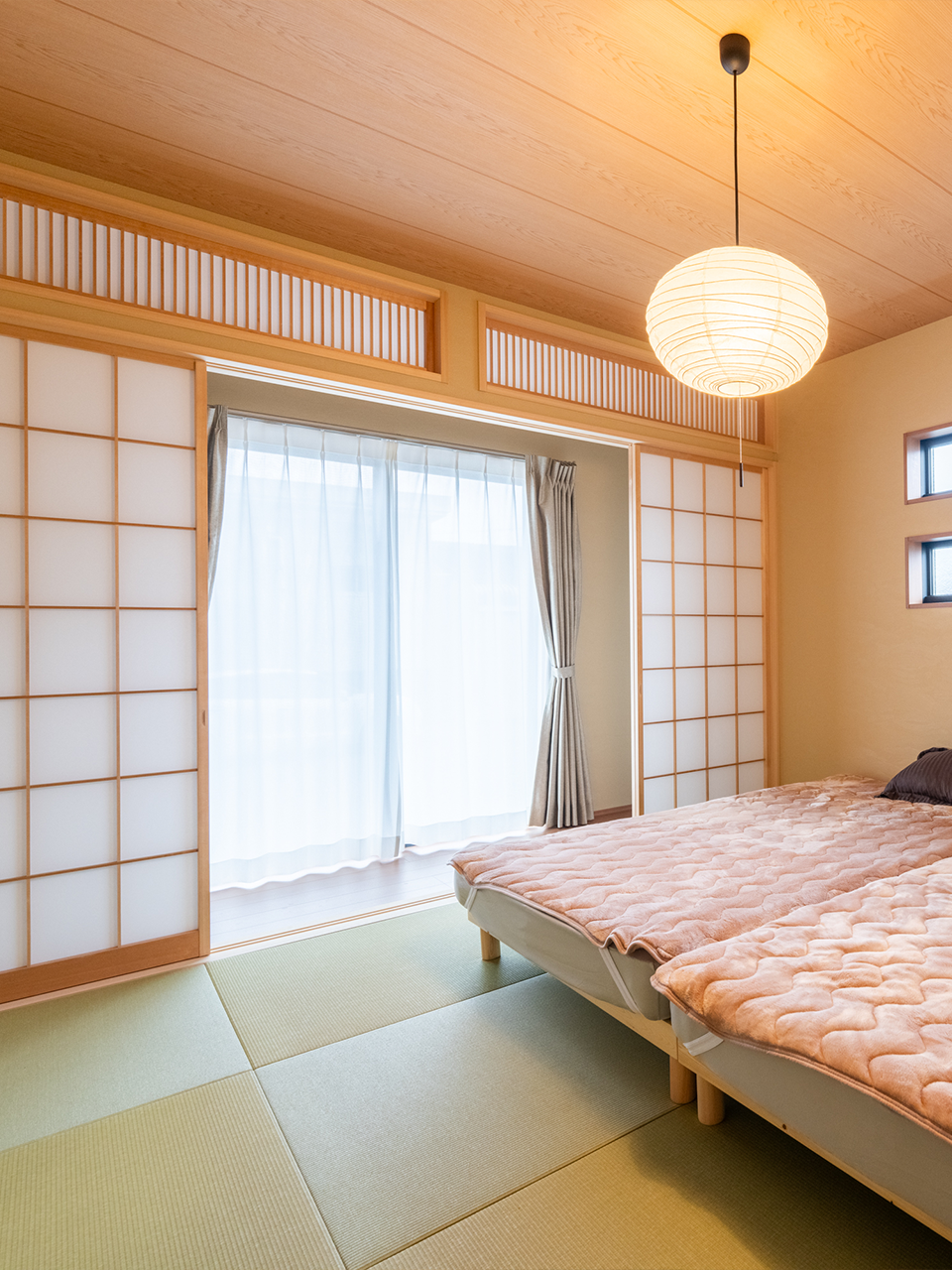 欄間付き障子と縁無し半帖畳が