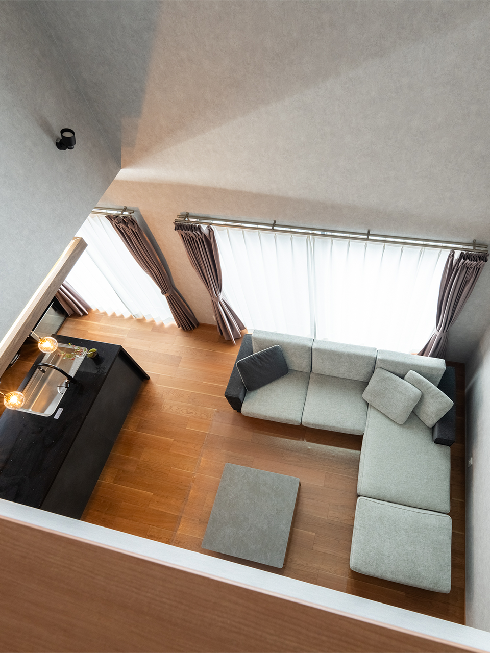 雰囲気良く、リビング上部の吹抜は